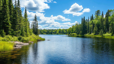 Quiet lake surrounded by forests in the Canadian wilderness, with space for text above
