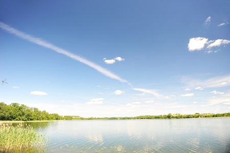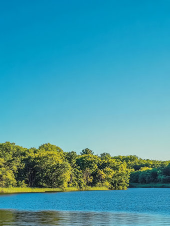 A serene lakeside view features calm waters reflecting a vivid blue sky. Lush greenery surrounds the lake highlighting the tranquility of a summer day in nature.