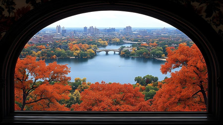 Aerial View of a Picturesque Lake Surrounded by Autumn Foliage in Vibrant Red, Orange, and Yellow Colors. Concept of Nature, Fall, Tranquility, Scenic Landscape.