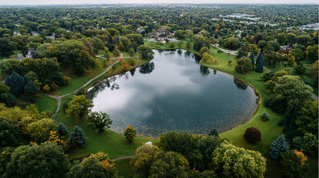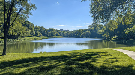 A serene park scene featuring a calm pond, surrounded by lush trees under a clear blue sky, providing a perfect getaway for relaxation and nature appreciation.