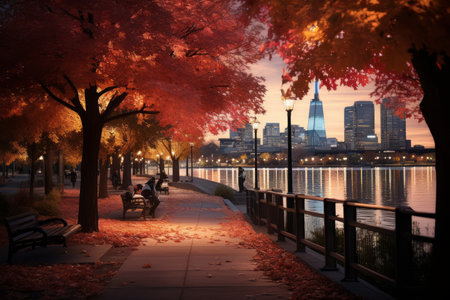 A breathtaking view of a city skyline at sunset, with vibrant clouds reflecting on calm waters. Perfect for showcasing urban beauty and natural tranquility.