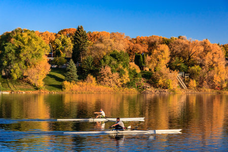 Two people are rowing a boat on a lake. The water is calm and the sky is clear. The trees surrounding the lake are full of leaves, creating a beautiful autumn scene