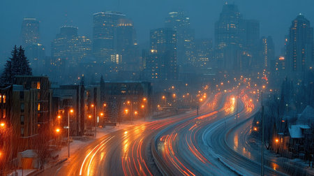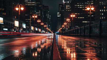 A vibrant city skyline is illuminated at night with skyscrapers glowing in the dark. Traffic streaks along the wet road creating colorful light trails that enhance the urban atmosphere.