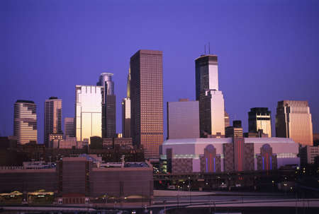 Minneapolis downtown skyline in Minnesota, USA at sunset