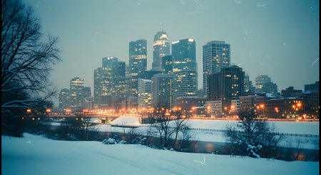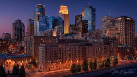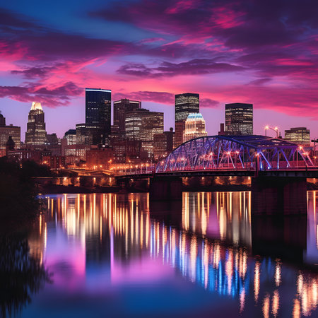 Stone Arch Bridge and Minneapolis skyline at dusk, with the Mississippi River reflecting the city's vibrant lights. A picturesque urban scene