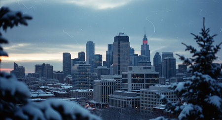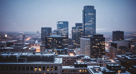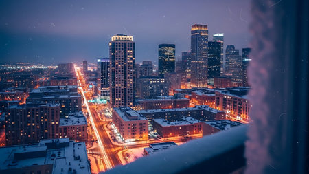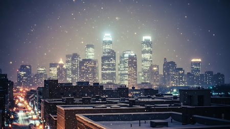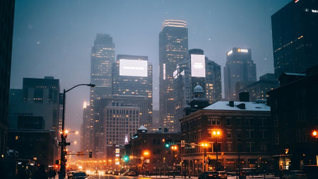 Cityscape of Chicago at night under snowfall, Illinois, USA