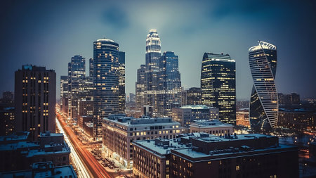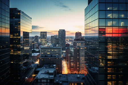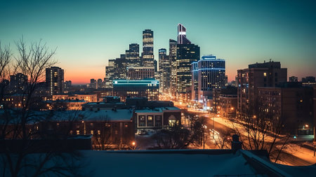 Glowing cityscape with skyscrapers and modern architecture illuminated at dusk generated by artificial intelligence