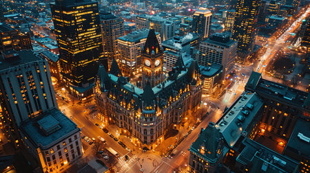 Capture the breathtaking beauty of an urban sunrise from above in a stunning photograph From the lofty perspective of a drone reveal the mesmerizing interplay of light and shadow over a sprawling cityscape Skyscrapers stand tall their architectural details enhanced by the golden hues of the awakening sun