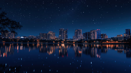 This stunning night cityscape captures the vibrant lights of urban life reflecting off a serene water surface, showcasing an enchanting skyline and inviting atmosphere.