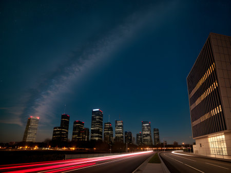 Vibrant Cityscape Illumination, Night Photography Showing Skyscrapers and Long Exposure Light Trails