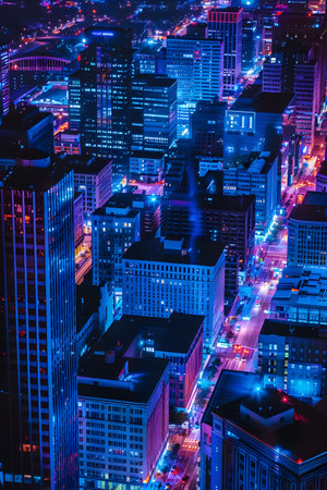 Aerial view of Chicago downtown skyline at night, Illinois, USA.