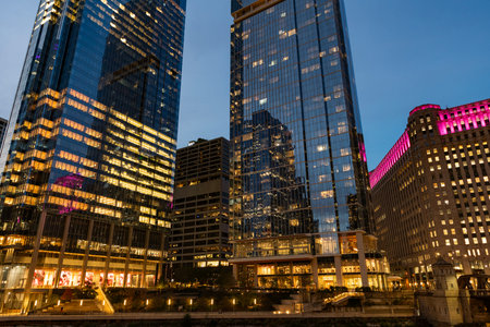 Business city. Night cityscape of Chicago skyscraper building. Chicago architecture of skyscraper. City night illuminated building. Skyscraper cityscape. Night city of Chicago. Nighttime city
