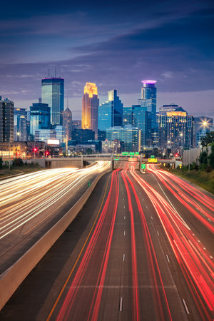 Minneapolis, Minnesota, USA. Cityscape image of downtown Minneapolis, Minnesota, USA with busy highway leading in to the downtown at twilight blue hour.