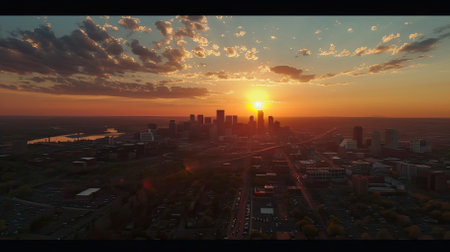 A city skyline is viewed from a grassy hill, capturing a scenic sunset. The composition includes buildings, trees, and a waterway under a colorful sky. The warm lighting and soft textures create a picturesque environment suitable for diverse commercial applications and editorial content.