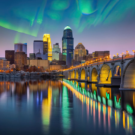 Explore the breathtaking night skyline of Minneapolis, showcasing illuminated skyscrapers and a serene twilight sky in an urban landscape.