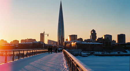 Winter cityscape with skyscrapers in the background at sunset.