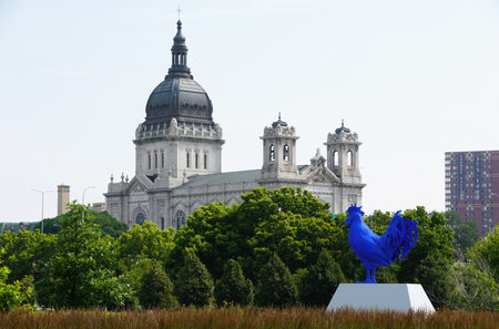 Minneapolis, Minnesota, U.S.A - July 9, 2024 - The distance view of Basilica of Saint Mary and the giant blue rooster at Minneapolis Sculpture Garden