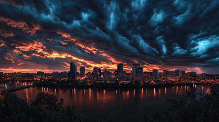 Cityscape at night under a dramatic sky filled with heavy, swirling clouds, lights reflecting off distant buildings, creating a moody scene.