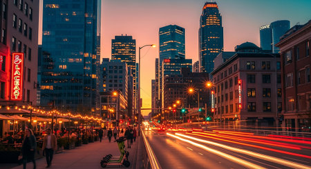 A stunning view of a vibrant city landscape, showcasing a blend of modern skyscrapers and historic buildings under a clear sky during the golden hour, inviting exploration.