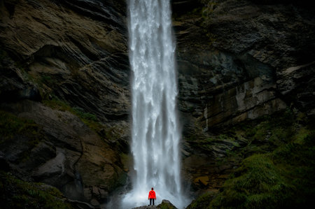 Kvernufoss waterfall in the gorge of the mountains. Tourist Attraction Iceland. Man in red jacket standing and looks at the flow of falling water. Beauty in nature