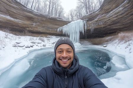A smiling man takes a selfie in front of a frozen waterfall surrounded by snowy cliffs
