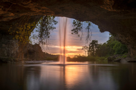 A serene waterfall cascades from a cave opening, framing a vibrant sunset over a tranquil pool of water.