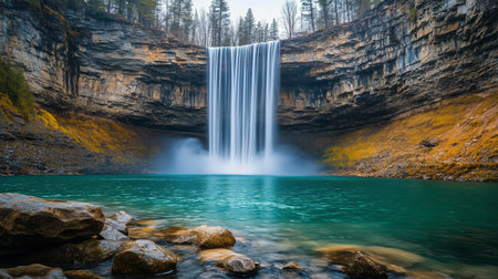 Tranquil and picturesque autumnal waterfall oasis surrounded by vibrant fall colors. Reflecting the natural beauty of the serene landscape and the idyllic wilderness