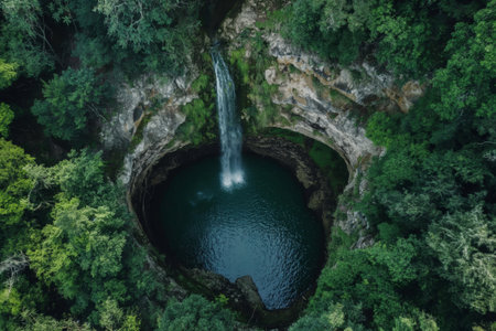 Aerial view of a tranquil waterfall cascading into a secluded circular pool surrounded by lush forest