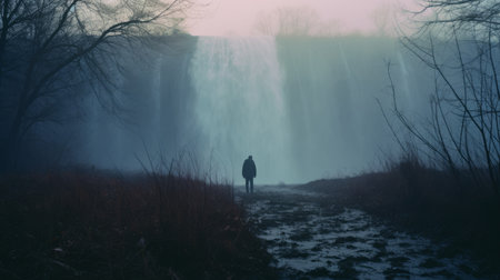 a mysterious anthony walks through autumn grass on a cold morning, captured in a lo-fi, instamatic style photograph. the image showcases a distant waterfall, surrounded by tall tree silhouettes and enveloped in a foggy atmosphere. the cold blue tones add to the overall ambiance of the scene. ai generated
