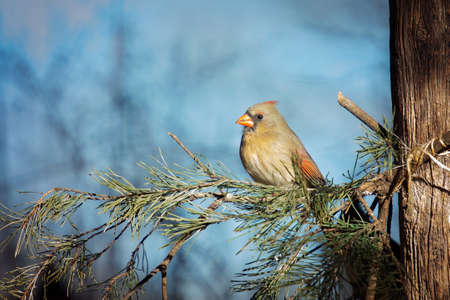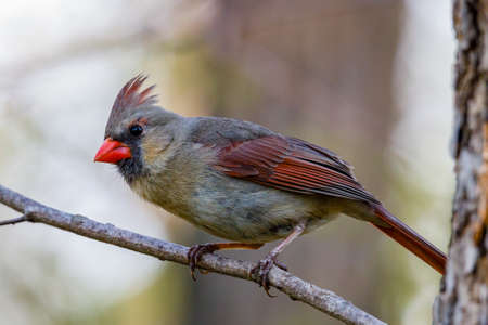 Female Northern cardinal (Cardinalis cardinalis) perched on a tree limb during spring. Selective focus, background blur and foreground blur.