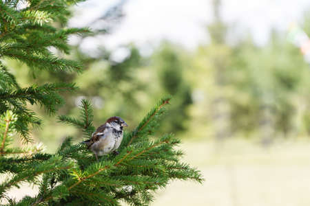 female of small beautiful bird house sparrow, Passer domesticus, bird sitting on the tree branch in winter garden