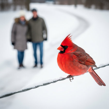 Two vibrant cardinals, one male and one female, perch gracefully on a branch. Their striking colors contrast beautifully against the clear winter sky, showcasing nature's artistry.