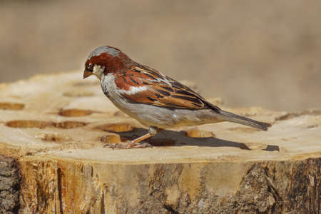 A closeup shot of a beautiful lonely house sparrow sitting on a stump