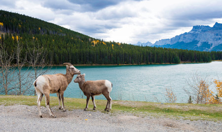 Sheep roam at Two Jack Lake, near Lake Minnewanka and Banff, Alberta, Canada.