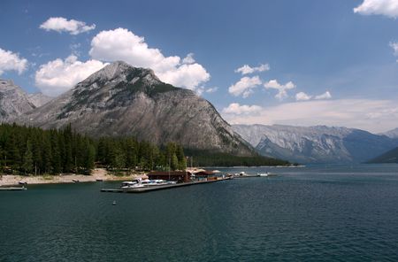 LAKE MINNEWANKA, CANADA - JULY 26, 2014: Lake Minnewanka Cruise Boats in Banff National Park.