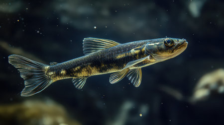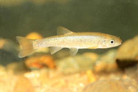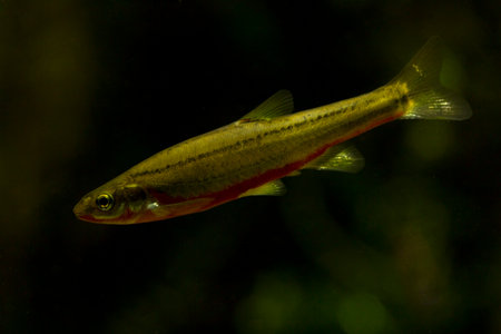Eurasian minnow (Phoxinus phoxinus) is a small species of freshwater fish in the carp family Cyprinidae. Swimming in in water of river.