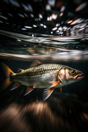 A stunning image of a vibrant fish gracefully swimming in clear water, captured against a visually appealing bokeh background. The scene evokes tranquility and showcases the beauty of aquatic life.