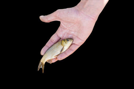 Small roach in man's hand caught in cold stormy day