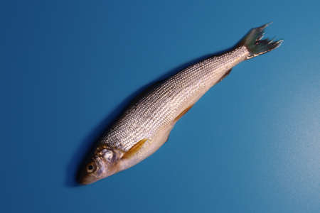 School of river fish. Flat lay of fish on a blue background.