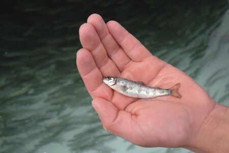 The little fish with a dry fly attached to the mouth