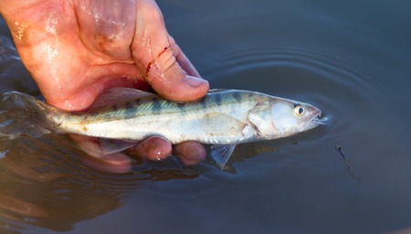 fisherman caught a small fish on the hook with a worm.