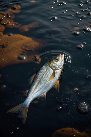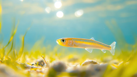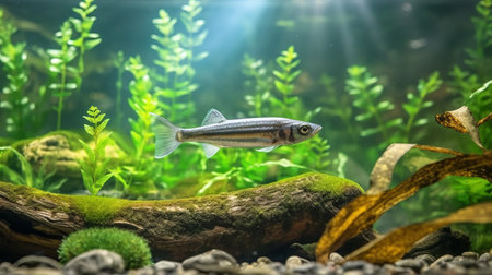 Silver fish swims among aquatic plants in a serene lake., generative AI