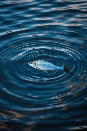 A small minnow fish lost in the vastness of an open lake.