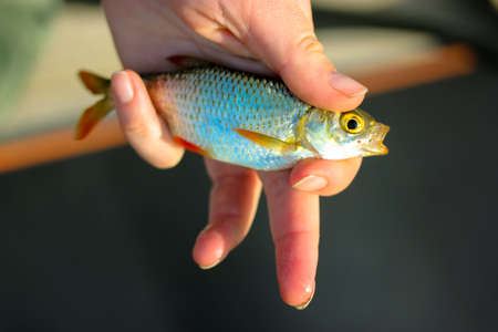 Girl holding in the hands of a live fish caught on the river