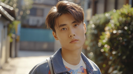 Close-up of a young asian man in casual clothing, looking pensive against a blurred urban background