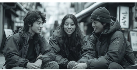 Group of positive Korean students on street portrait image, ai generated. Happy japanese friends walking together picture photorealistic photography. Urban lifestyle concept photo realistic