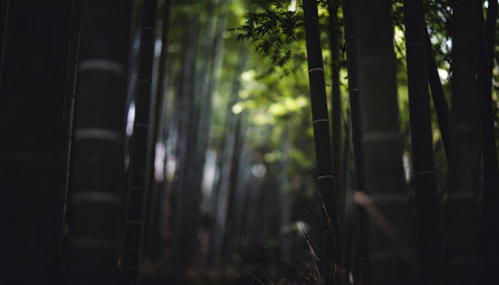 Dense bamboo grove with tall, swaying green trees, their thin leaves rustling softly as a breeze passes through the forest