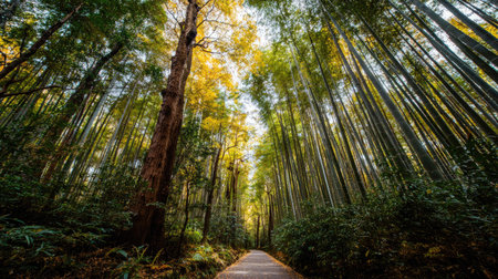 A pathway meanders through a forest of tall trees, creating a visually striking composition. The image showcases the vertical lines of the trees and a vibrant interplay of light and shadow, highlighting green and brown tones. This natural environment evokes a sense of tranquility, suitable for various editorial and commercial applications.