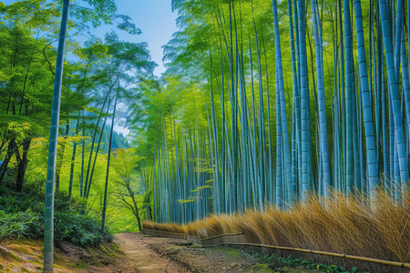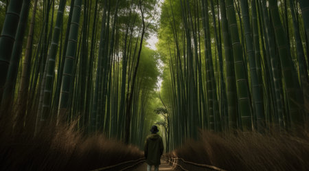 way through tall bamboo forest trees with bushy green tops, generative ai