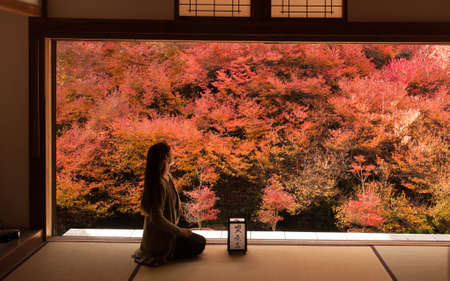 Young woman traveler enjoying beautiful autumn in Japan, Travel lifestyle concept